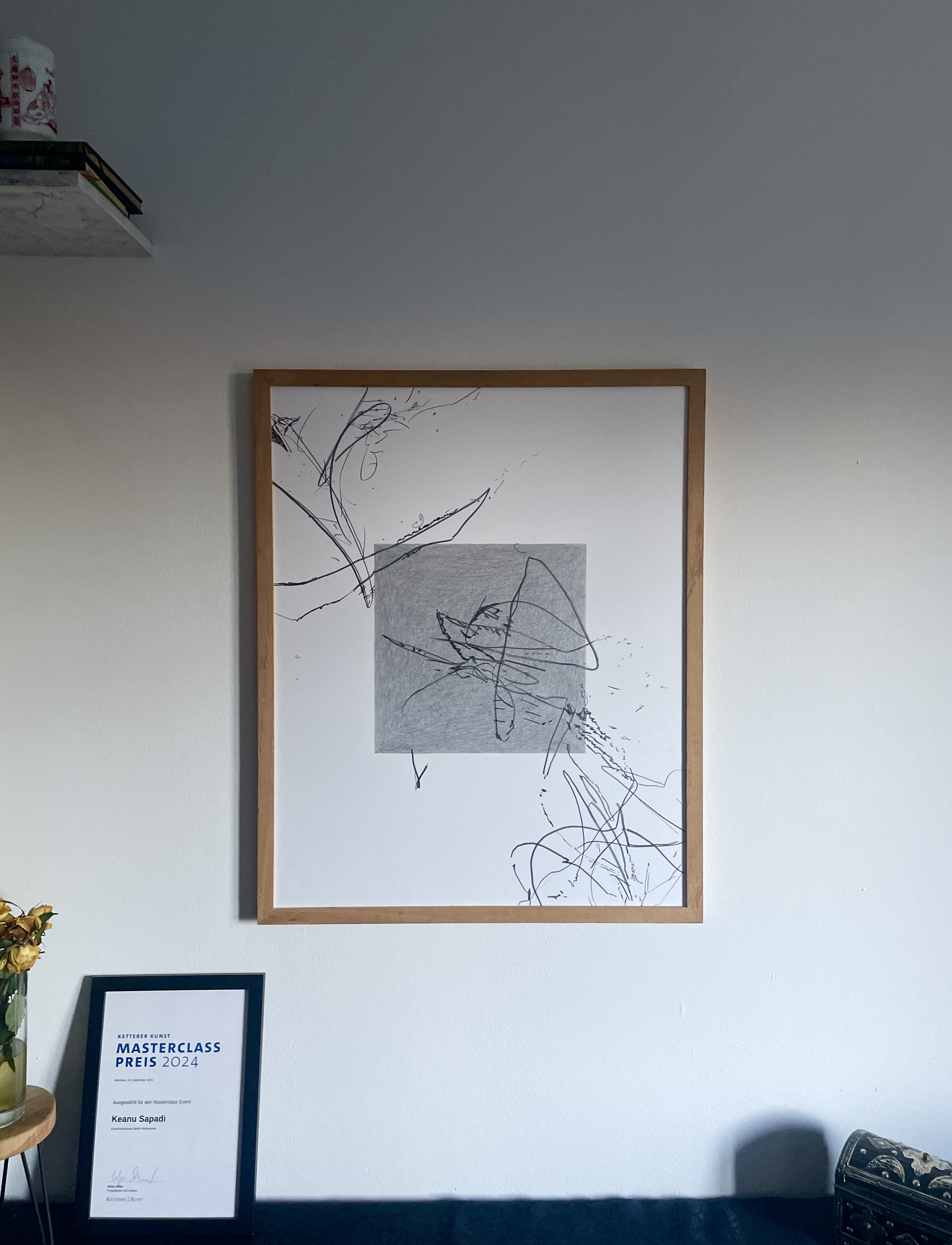 Die Technik des Künstlers führt zu einer glaslosen Rahmung. Sie betont den offenen Charakter des Bleistifts und kreiert ein ausbalanciertes Zusammenspiel zwischen lockerem Material und intensiver Technik. Der Holzrahmen wurde für Ausstellungsstücke in Kunstgalerien der DDR verwendet. Er knüpft ein Stück Vergangenheit an die Geschichte des Künstlers. Der Rahmen ist Teil des Kunstwerks.