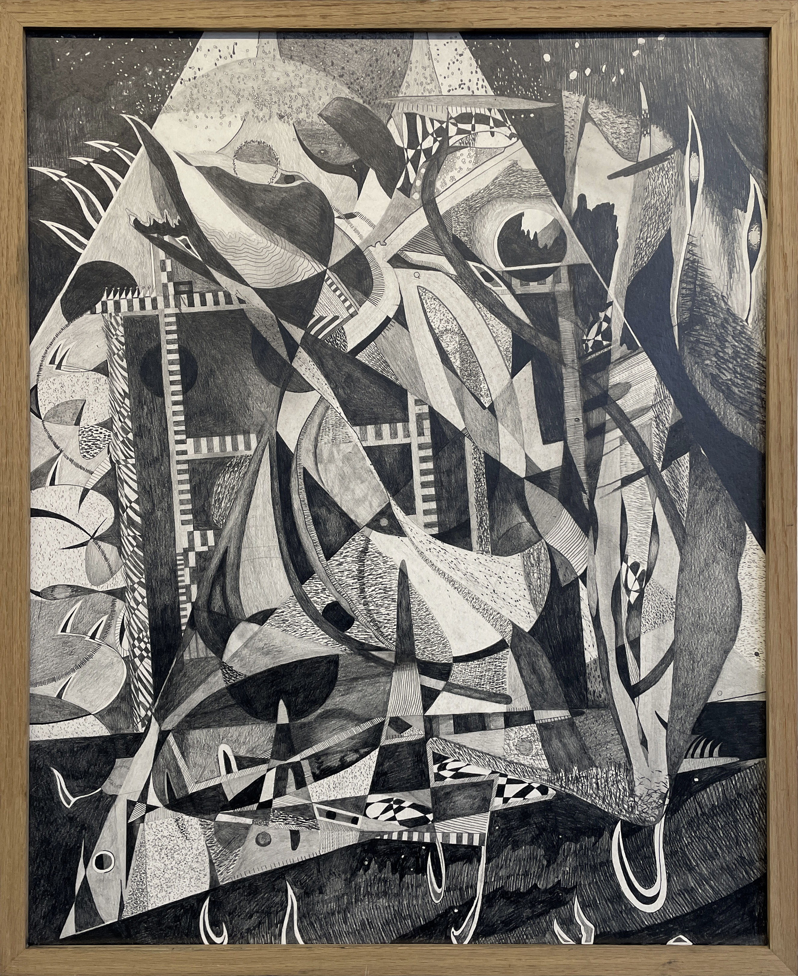 "Mindmap" (2023) ist eine reine Graphitzeichnung und hat eine Größe von circa 77,5 x 62,5 x 4 cm. Besonders in diesem Werk ist die technische Präzision.