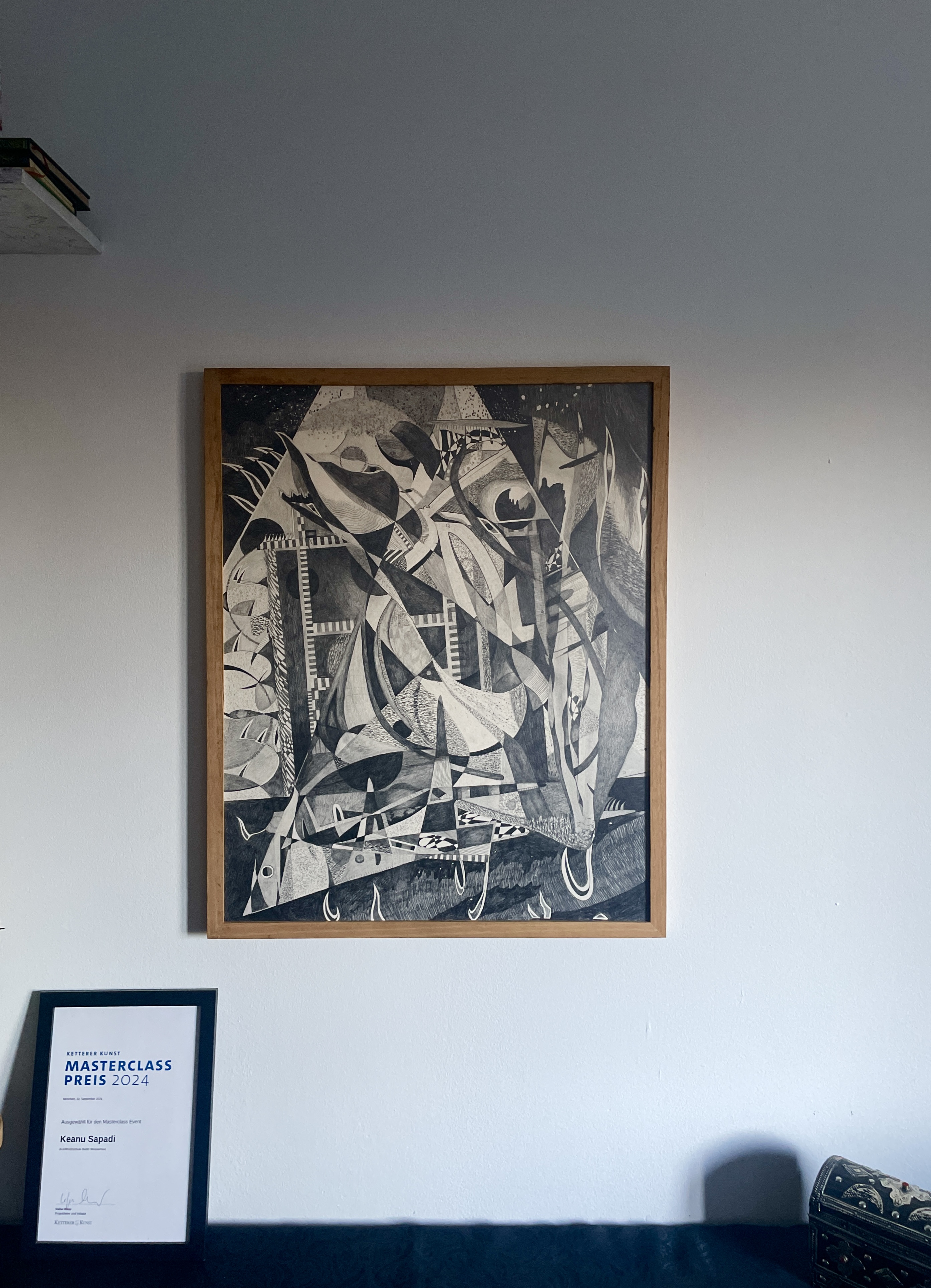Die Technik des Künstlers führt zu einer glaslosen Rahmung. Sie betont den offenen Charakter des Bleistifts und kreiert ein ausbalanciertes Zusammenspiel zwischen lockerem Material und intensiver Technik. Der Holzrahmen wurde für Ausstellungsstücke in Kunstgalerien der DDR verwendet. Er knüpft ein Stück Vergangenheit an die Geschichte des Künstlers. Der Rahmen ist Teil des Kunstwerks.